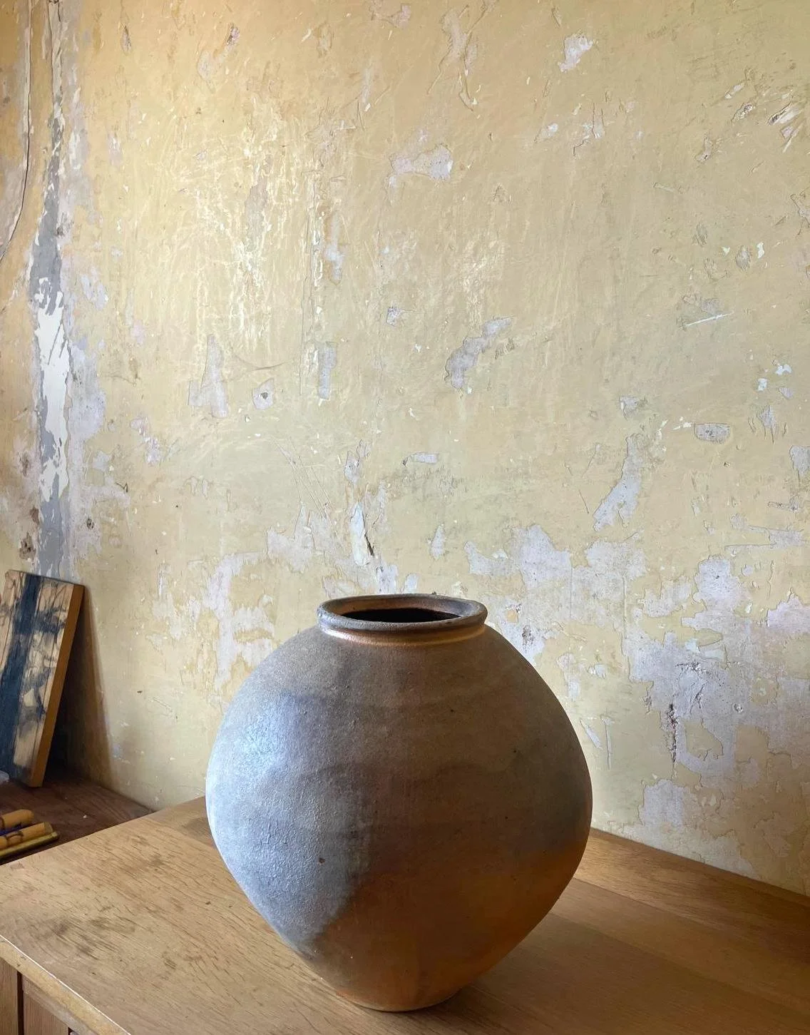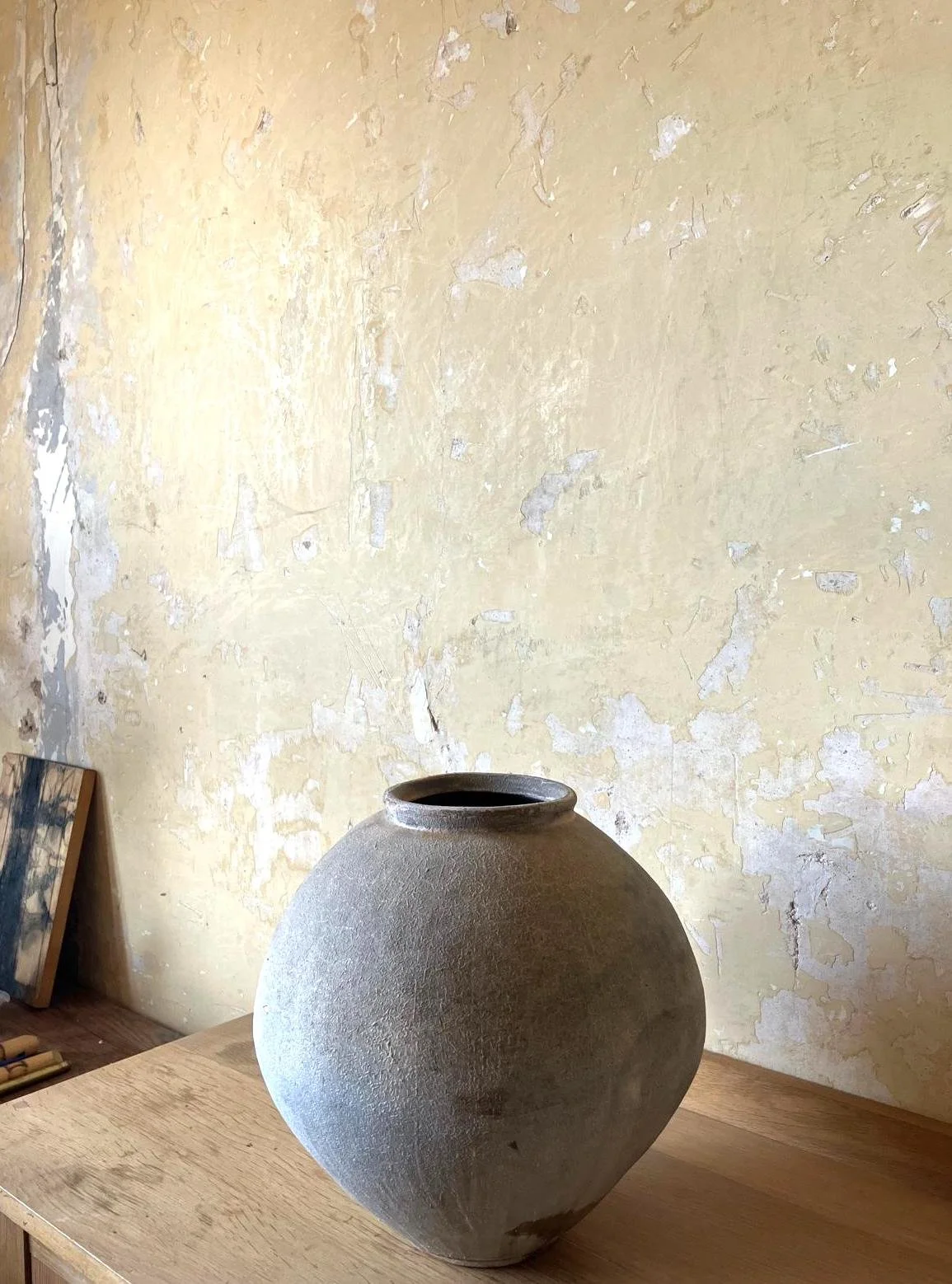 Carrying the texture of the rivers of the moon, this sensual piece invites a calm gateway to wonder. Wood-fired own stoneware blend, hand-built, china clay slips, natural ash glaze. Fired twice for 4 days and 3 nights in my anagama.